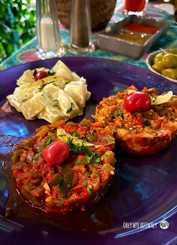 Po dotarciu na miejsce, w drodze do naszego hotelu umiejscowionego tym razem tuż za murami mediny, zatrzymaliśmy się w jadłodajni. Miejsce wyglądem nie budziło wielkiego zaufania. Obsługa przytakiwała na każde nasze zdanie, ale szybko zorientowaliśmy się, że nie mają pojęcia o czym mówimy. Wszędzie było pełno kotów zajadających zrzucane ze stołów jedzenie. W środku siedzieli jednak lokalsi, co przekonało nas do zajęcia stolika. Dostaliśmy więcej jedzenia niż chcieliśmy (właśnie przez problemy komunikacyjne), ale finalnie nie żałowaliśmy żadnego kęsa. Było smacznie i bez żołądkowych rewelacji.