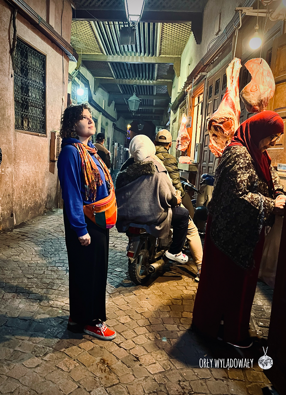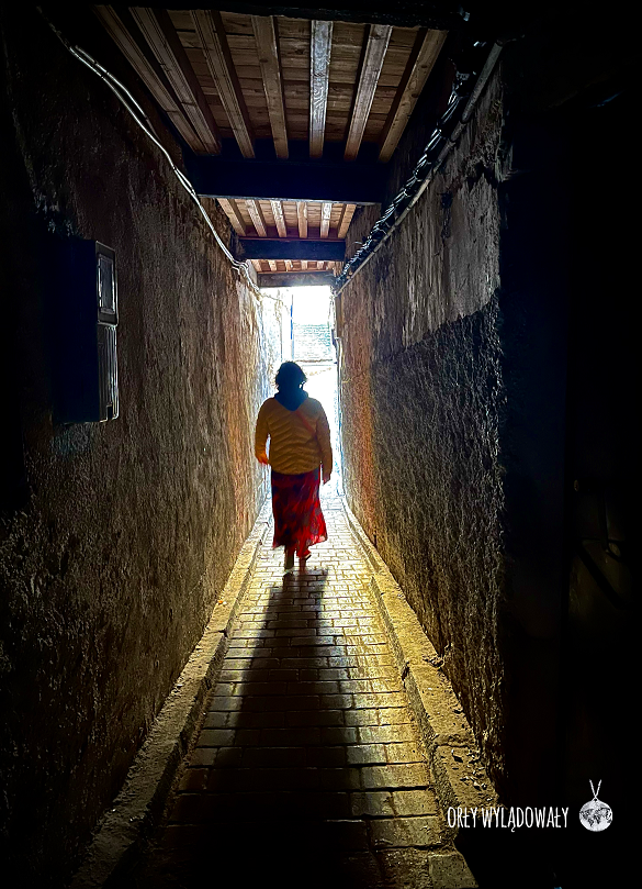 Fez od pierwszych chwil okazał się bardzo ciekawym miastem. Nocleg znaleźliśmy w ciasnym (naprawdę ciasnym) zakątku mediny, ale był to kolejny strzał w dziesiątkę. Aby tam się dostać musieliśmy pokonać labirynt wąskich niemalże na szerokość ludzkiego ciała uliczek. Jako, że byliśmy wyposażeni w plecaki nie stanowiło to żadnego problemu. Nie chciałbym jednak tam wlec za sobą walizki. Warto dodać, że wśród ciasnych uliczek aplikacja Google Maps staje się w zasadzie bezużyteczna. Pozostaje więc schować telefon do kieszeni i kierować się wskazówkami napisanymi na murach budynków.