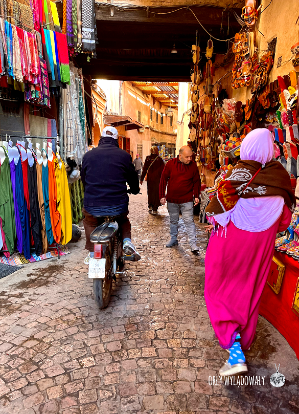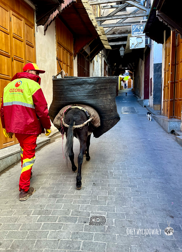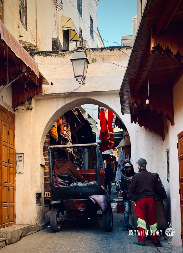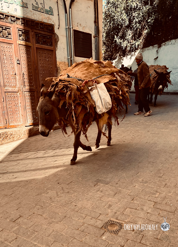 Nowy dzień, po kolejnym wyśmienitym śniadaniu, zaczęliśmy od zwiedzania targowych uliczek. Tak jak w Marrakeszu jest tutaj wszystko, jednakże całość wydaje się być ujęta w nieco spokojniejszej formie. Nie mijają nas żadne pojazdy zmotoryzowane. Co jakiś czas można spodziewać się tylko osiołka przenoszącego skóry lub towarzyszącego Panom sprzątającym ulice. Pod tym względem nowoczesność miesza się z tradycją. Towary przewożone są na różnego rodzaju taczkach czy wózkach. Ze sklepów nie słychać natarczywych nawoływań aczkolwiek sekunda okazanego zainteresowania z naszej strony nie umknie czujnym sprzedawcom.
