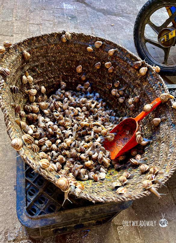 Spacerując po starym mieście kilkukrotnie przechodziliśmy koło Pana z wielkim garem wywaru ze ślimaków. Mijaliśmy także to danie w wersji nieugotowanej, próbujące uratować się ucieczką z koszyka. Jako koneserzy posiłków wszelakich, nie mogliśmy podarować sobie takiej atrakcji. Ślimaki wydłubuje się z muszli za pomocą wykałaczki. Te, których kosztowaliśmy zostały przyrządzone w bardzo pieprznym wywarze i całość przypominała nam w smaku polskie flaki.