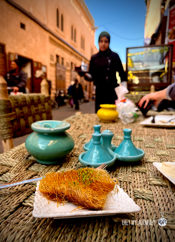 Po kulturalnych atrakcjach przyszedł czas na suk, czyli arabskie targowisko leżące w medinie. Po drodze przysiedliśmy jeszcze w przydrożnej knajpie na kawę i lokalną słodycz.