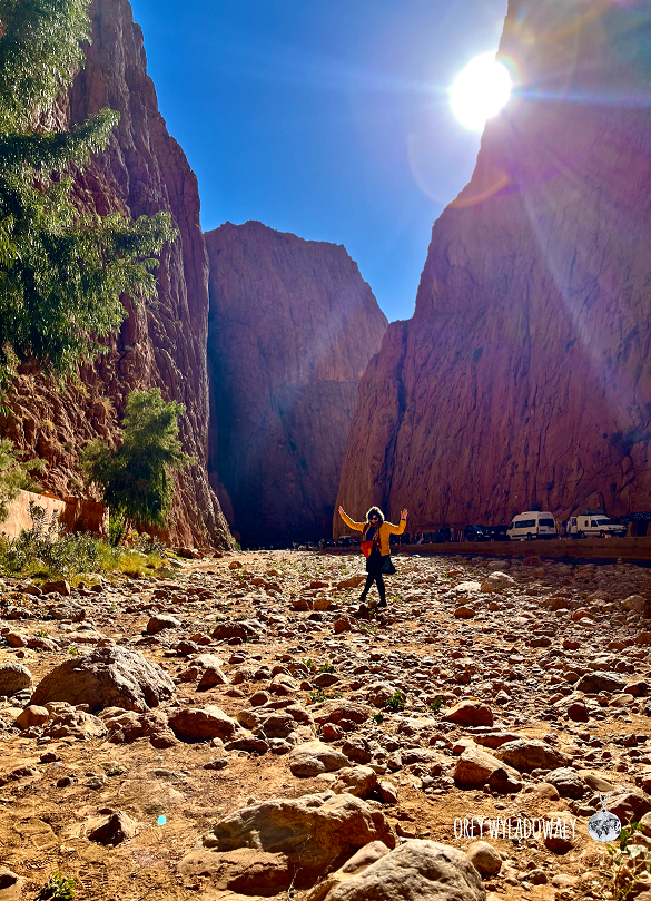 Przed samą pustynią został jeszcze jeden punkt na trasie – wąwóz przepływającej tędy rzeki. Ciągnie się on przez ok. 40 km, a jego ściany potrafią mieć nawet 400 m. wysokości. Jest to doskonałe miejsce dla fanów wspinaczki. Z racji bliskości podstawy ściany, śmiałków można nieuzbrojonym okiem obserwować w zasadzie z ulicy. Oczywiście ciężko to porównać np. z podziwianiem legendarnego El Capitan w dolinie Yosemite, ale widoki i tak robią duże wrażenie. Sama nazwa tego regionu pochodzi od imienia kobiety, która jako pierwsza przeszła przez góry, przeprowadzając przez nie leciwego już ojca. Nieopodal zjedliśmy obiad w dużo przyjemniejszym miejscu niż dnia poprzedniego i już bez postoju ruszyliśmy na piaski pustyni.