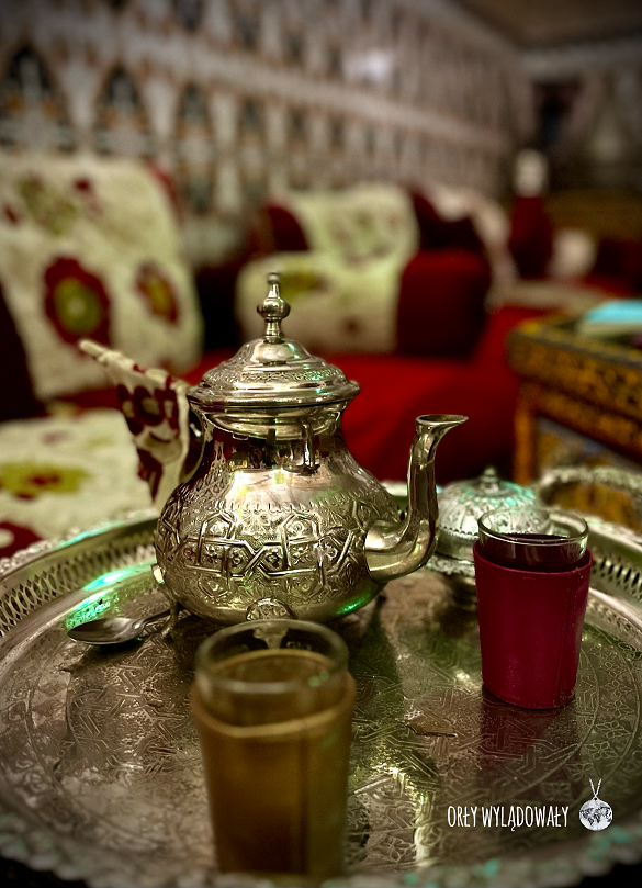 Do głównego dania dostaliśmy również marokańską sałatkę i mnóstwa różnych, drobnych przekąsek. Całość zakrapiana była przez nas marokańską whisky, czyli herbatą z miętą – dwa razy bardziej słodką niż cokolwiek co pijamy na co dzień, ale i tak wyśmienitą.