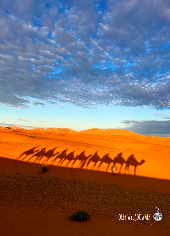 Merzouga, cel naszej wycieczki, to niewielka oaza w Erg Chebbi, czyli stepu przedsaharyjskiego. Technicznie rzecz biorąc nie jest to jeszcze Sahara, ale nam, pierwszy raz będących w takim krajobrazie nie robiło to różnicy. Tutaj też przesiedliśmy się na wielbłądy. Dla mnie była to pierwsza w życiu przejażdżka na grzbiecie jakiegokolwiek zwierzęcia. Kasia nie dość, że raczej stresuje się takimi atrakcjami (aczkolwiek rzadko kiedy odpuszcza – zuch dziewczyna), to jeszcze trafiła na wielbłąda fajtłapę. Był to najniższy zwierzak z całej karawany, który na samym początku wyprawy potknął się o własne nogi prawie upadając. Nic się jednak nie stało więc pomaszerowaliśmy dalej. Fajtłapa umilał sobie czas zajadając się paskiem od plecaka współpodróżnika z Casablanki, jadącego przed Kasią. Przez pół godziny zjadł jego sporą część i już brał się za plastikową klamrę, ale na szczęście karawana dotarła do celu.