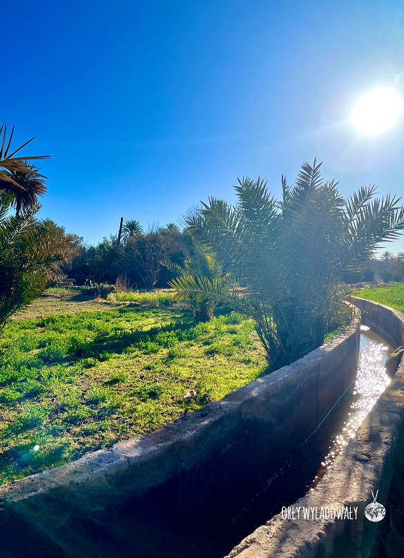 O poranku, po śniadaniu ruszyliśmy w dalszą drogę. Cała grupa okazała się bardzo zdyscyplinowana i była gotowa już przed umówionym czasem. Tym razem zatrzymaliśmy się na zdjęcie przy „Les Pattes de Singes” (Małpie Łapy), czyli ciekawie uformowanych formacjach skalnych. Kolejny przystanek już w oazie Thingir. Ciągnie się ona przez 48 km wzdłuż rzeki Todra Gorge. Po ponad dobie przemieszczania się przez wysuszony krajobraz pełen kurzu i piasku wpadliśmy w sam środek tętniącej zielenią uprawy palmy daktylowej, oliwki, czy też lucerny. Woda po całej oazie rozprowadzana jest kanałami irygacyjnymi. Ziemię podzielono na małe parcele uprawiane przez mieszkańców, którzy to wymieniają się między sobą plonami. Po ogrodach oprowadził nas Berber płynnie zmieniając języki z angielskiego na francuski i hiszpański, wplatając w to wszystko słówka włoskie i polskie. Później trafiliśmy do lokalnej wytwórni dywanów gdzie pokazano nam ręczny proces ich produkcji oraz opisano ich rodzaje. Całość oczywiście ma na celu zachęcenie do kupna, aczkolwiek wielkiej presji nie czuliśmy.
