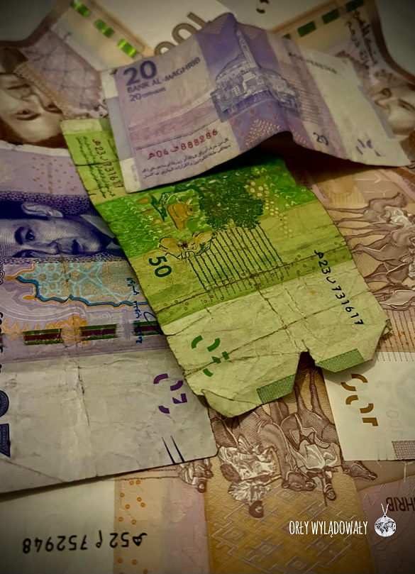 - Waluta: dirham marokański (1 PLN ~ 2,5 MAD). Na lotnisku w Marrakeszu można spodziewać się nieco mniej korzystnego kursu wymiany niż w samym mieście. Do wymiany najlepiej mieć € lub $. Wymiana pieniędzy jest koniecznością, raczej nie można liczyć na płatności kartą (stan na 2023).